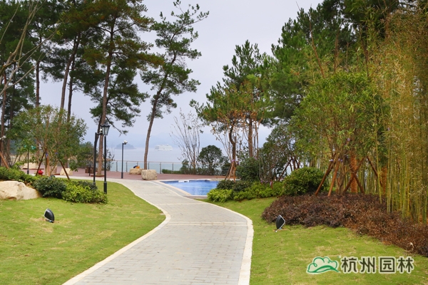 該工程位于浙江省淳安縣千島湖大石坪半島,主要施工內容包括綠化種植、硬質鋪裝、景觀土建、景觀水電安裝等。千島湖以大旅游業為龍頭的服務經濟前景廣闊,該酒店獨具特色的綠化景觀將成為千島湖酒店服務領域的一大亮點。