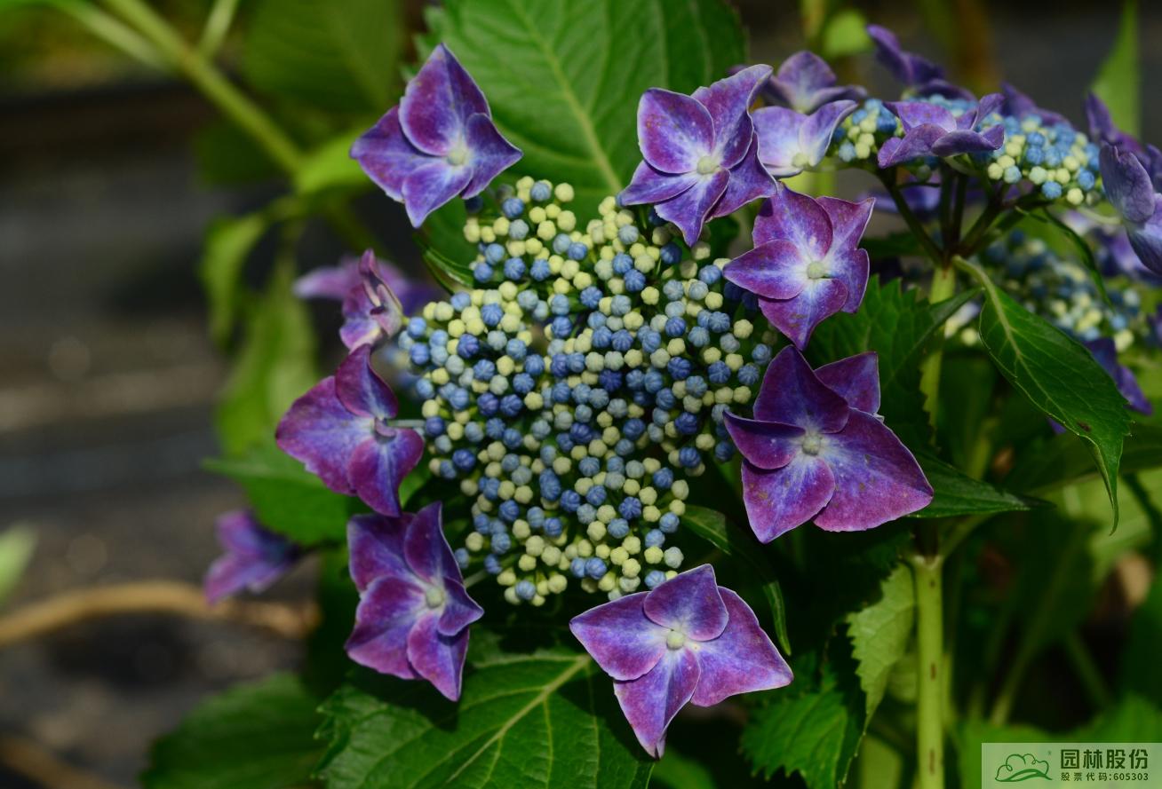 大葉繡球‘紫之夢’:傘房狀聚傘花序盤狀,高度2~4cm,直徑8~12cm,上海及杭州5月中下旬開花,可延續至6月下旬;不孕花主色紫紅色先端白色中部藍色,基部白色;可孕花花瓣藍色;花序直立性強,花色艷麗,花量大,開花能力強,適合家庭園藝和各式園林景觀。