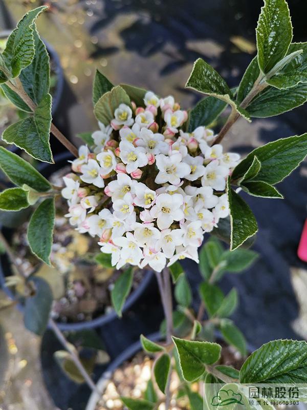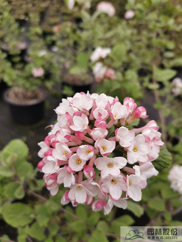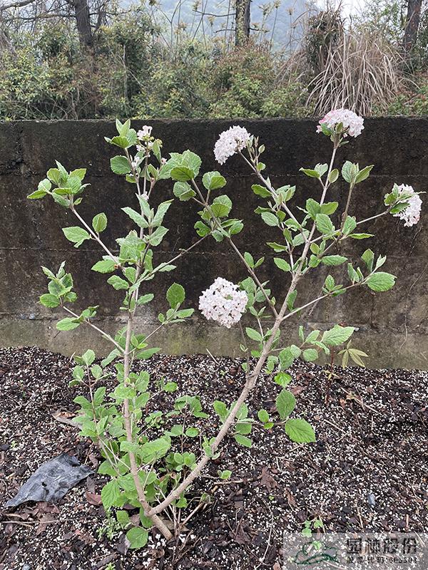 忍冬科莢蒾屬,半常綠或常綠灌木,株高2-3 m,為紅蕾莢蒾和煙管莢蒾的雜交種。葉色深綠,秋季轉紅,顏色程度因所處地區(qū)而異。該種繼承了紅蕾莢蒾粉花的優(yōu)良基因,花序未開放時呈現(xiàn)靚麗的粉色,開放后白色,且具有較濃郁的花香。花徑一般4.5-10 cm,花期3-4月。植株具有良好的頂端優(yōu)勢,枝條年生長量大,但分枝能力稍弱。幾乎無病蟲害。適應性強,生長速度快,耐干旱且耐寒,適合自然風格的工程應用或庭院觀賞。