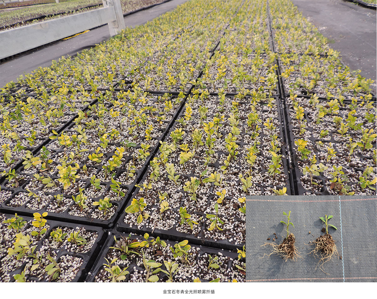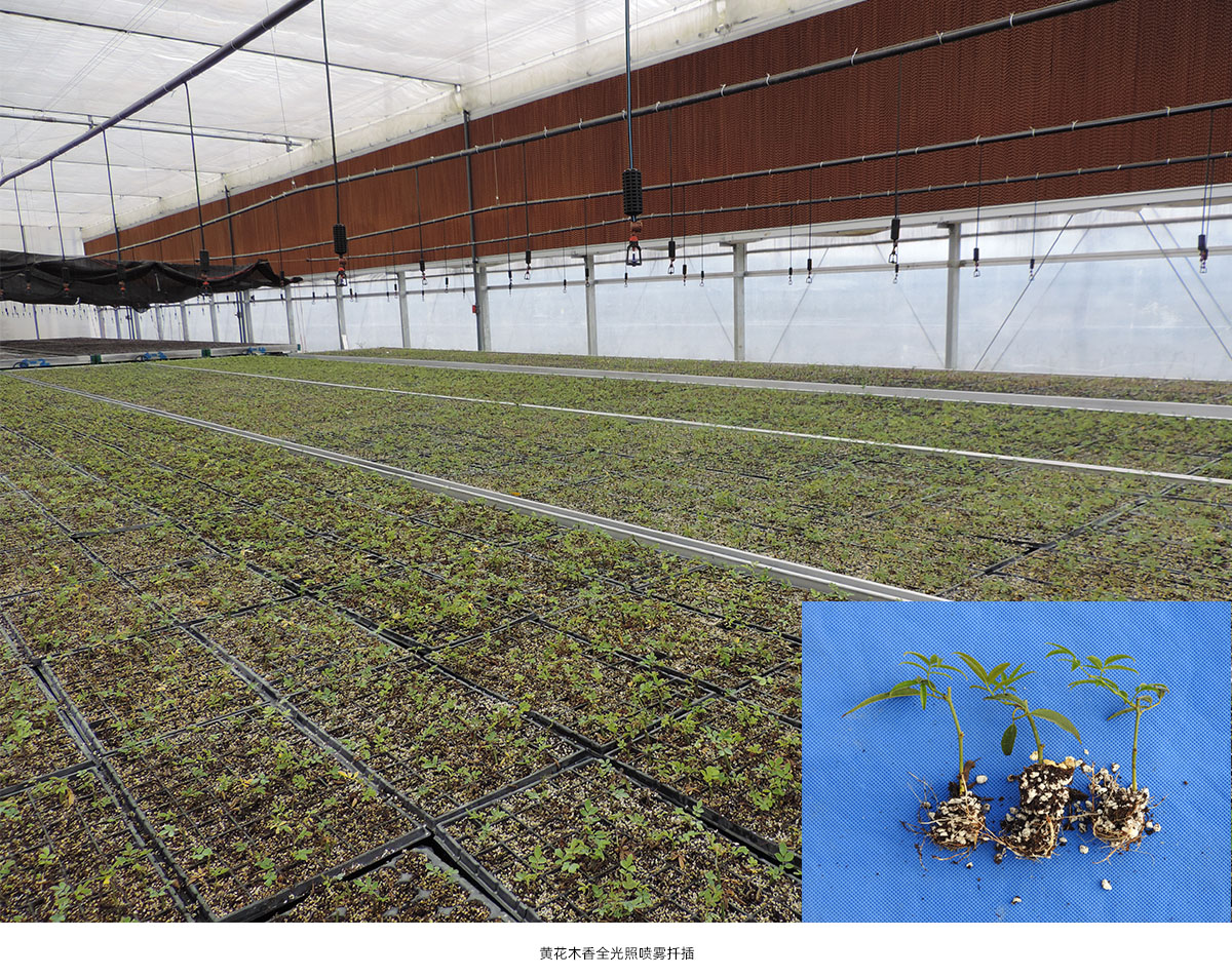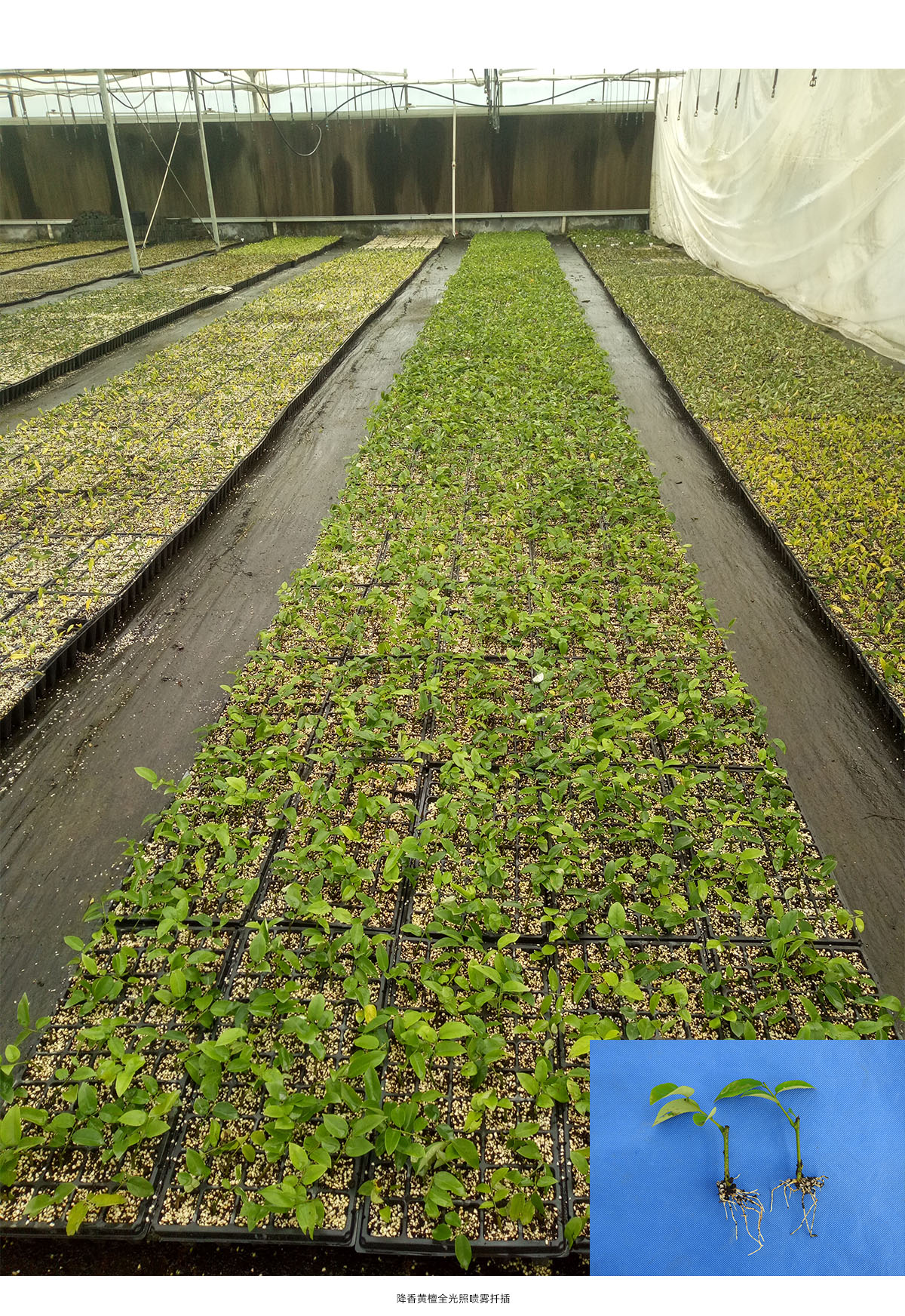 (1)全光照噴霧扦插育苗技術 全光照噴霧扦插技術具有生根期短、成活率高和操作簡單等優(yōu)點。研究院已建立了桂花、冬青、降香黃檀、新優(yōu)宿根植物等數(shù)百種植物的全光照噴霧扦插技術體系,年度育苗量200多萬。