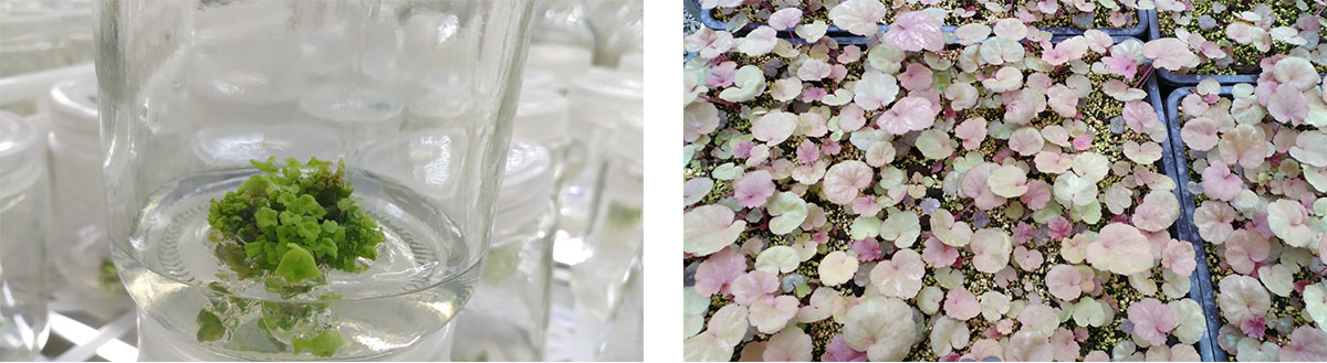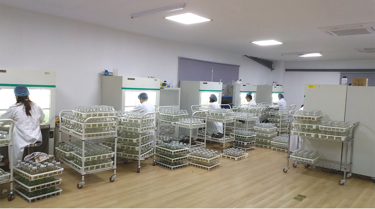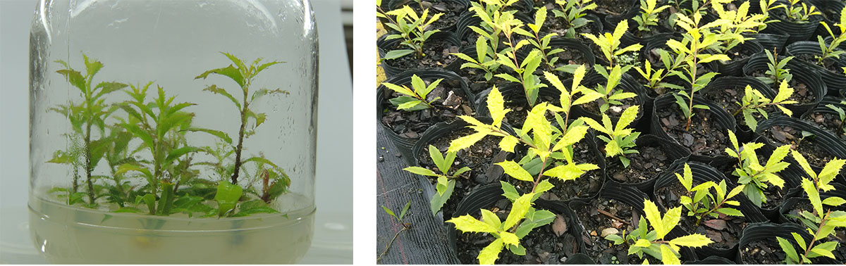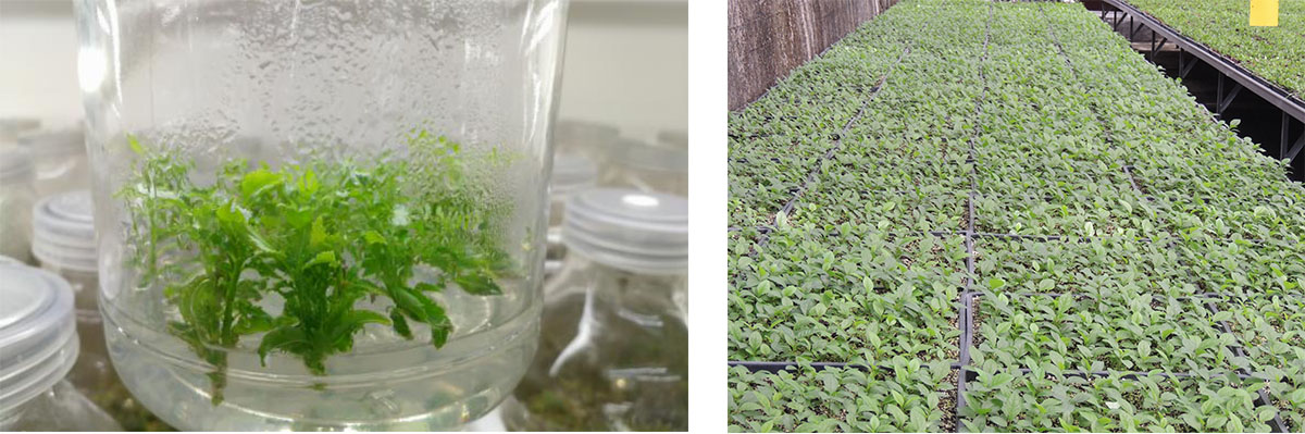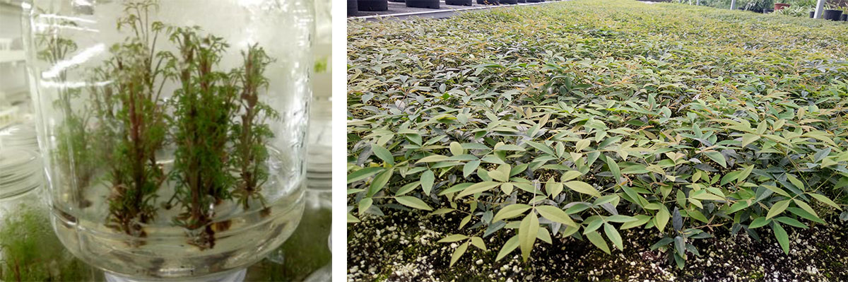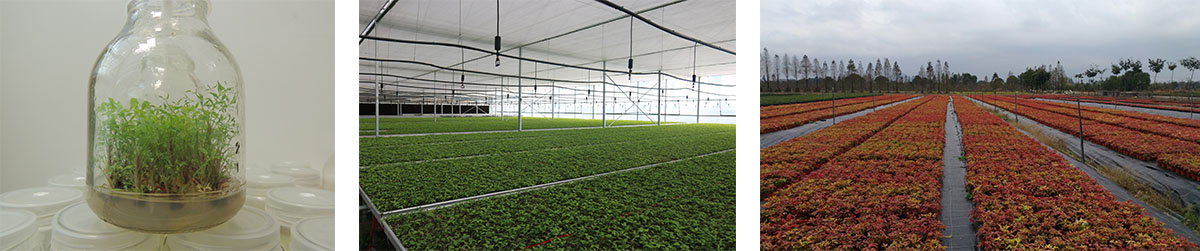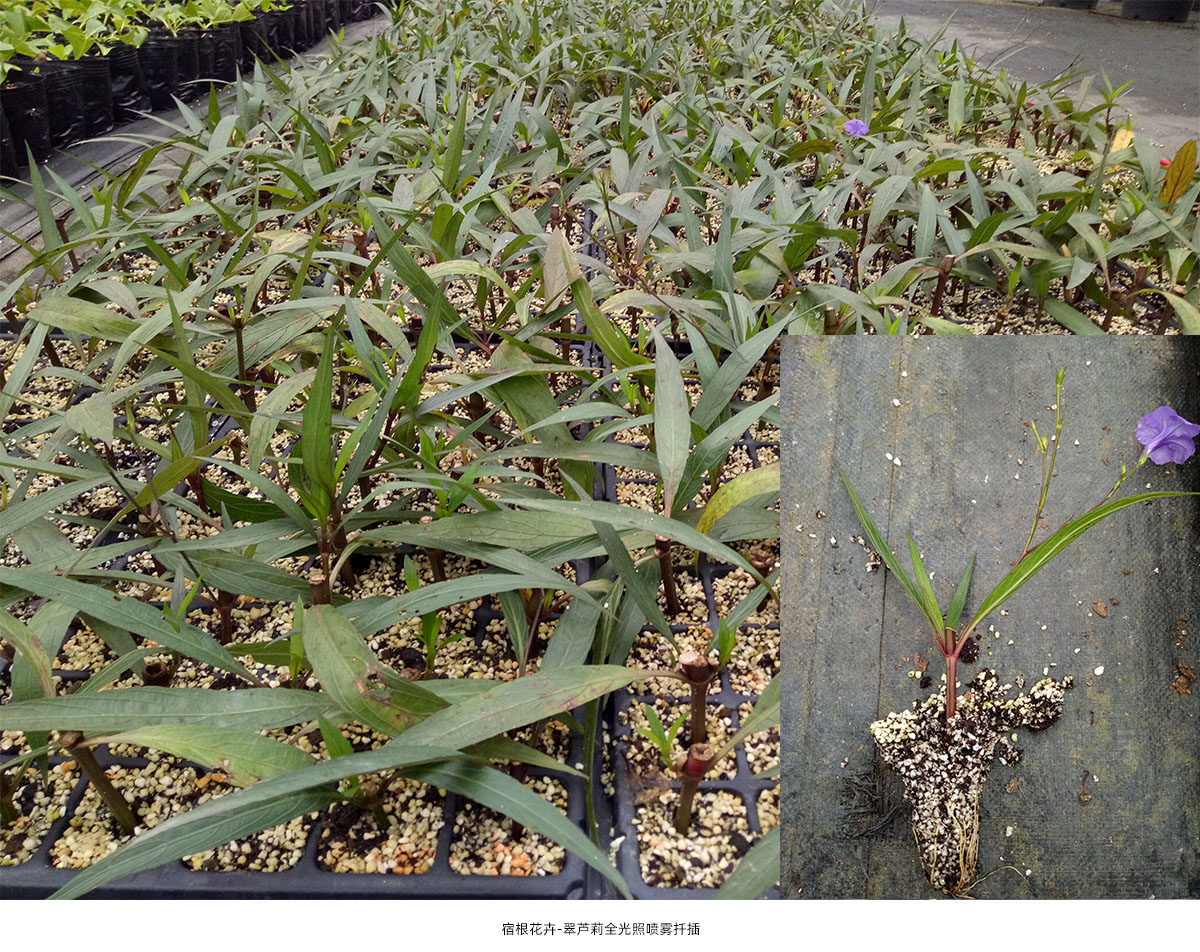 (1)全光照噴霧扦插育苗技術 全光照噴霧扦插技術具有生根期短、成活率高和操作簡單等優(yōu)點。研究院已建立了桂花、冬青、降香黃檀、新優(yōu)宿根植物等數(shù)百種植物的全光照噴霧扦插技術體系,年度育苗量200多萬。