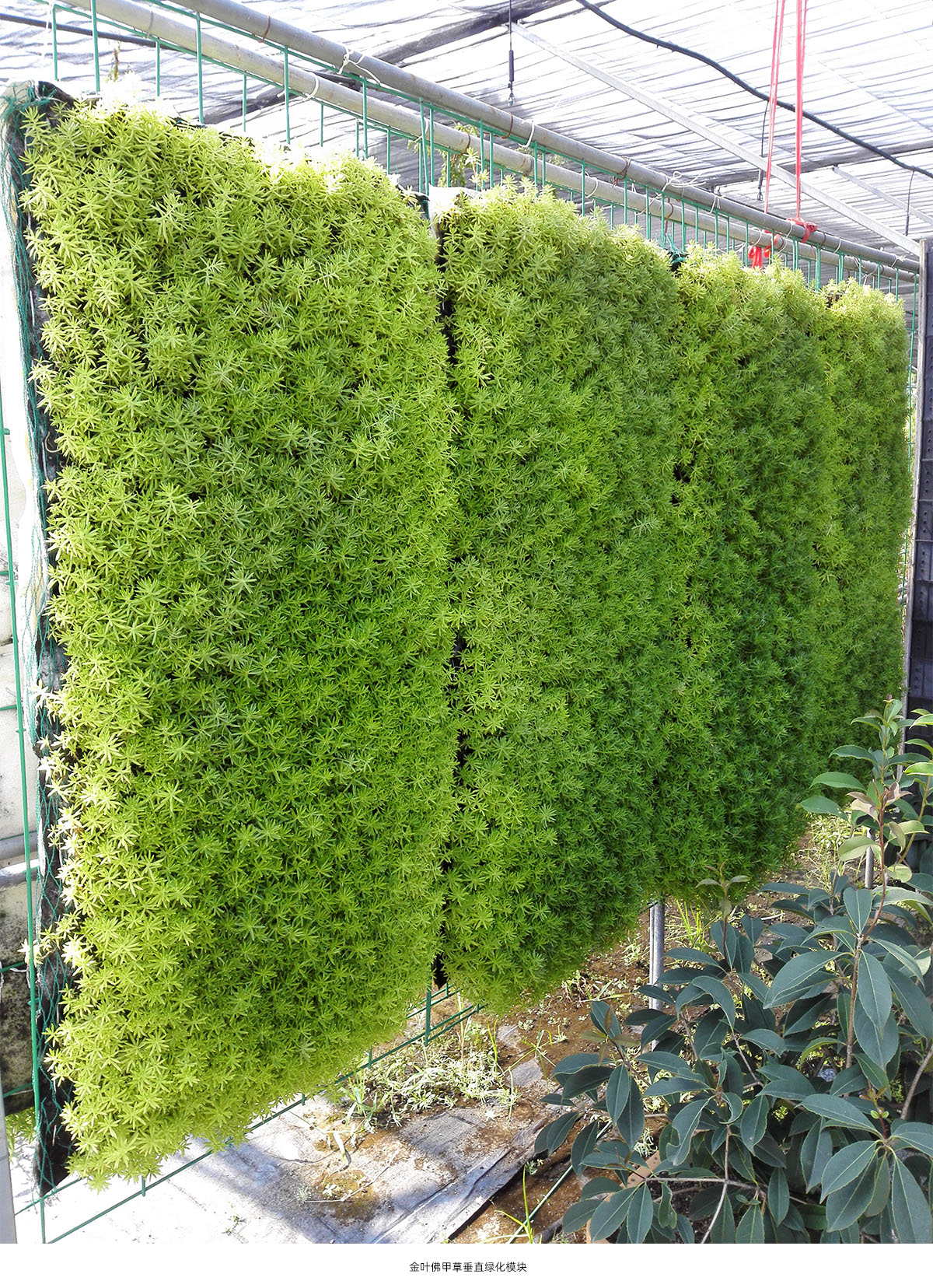 利用土工布、巖棉剪裁成一定規格與金葉佛甲草相結合,并運用工程技術,制作出四季便攜式、輕型、降溫的金葉佛甲草垂直模塊。達到立竿見影的景觀效果且生產周期短的目的,有利于大規模推廣運用。